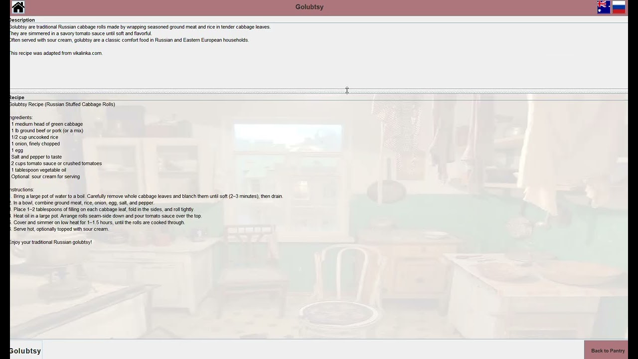 Pantry Passport is a cross-cultural software interface that connects Australian users to Russian cuisine that they can cook using ingredients that they already have in their... Pantry! As a part of this project, we were tasked with developing a tool to help one culture learn from another, neither of which could be American English speakers.